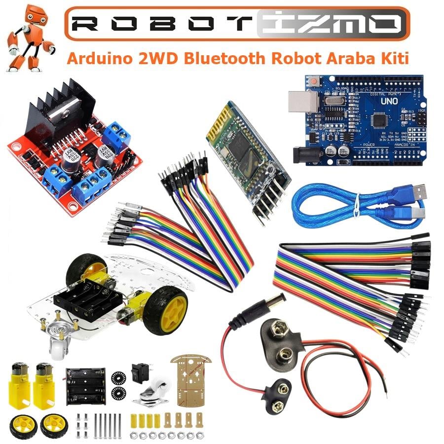 Bluetooth kontrollü, kolay montajlı 2WD Arduino robot araba kiti. Motor sürücü, Bluetooth modül ve bağlantı kabloları dahil tam set.